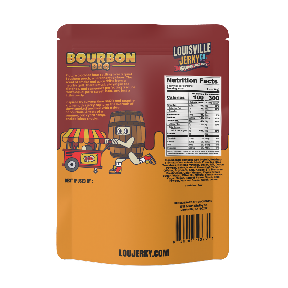 Ingredients: Textured Soy Protein, Ketchup (Tomato Concentrate Made From Red Ripe Tomatoes, Distilled Vinegar, Sugar, Salt, Onion Powder, Spice, Natural Flavoring), Tamari (Water, Soybeans, Salt, Alcohol [To Preserve Freshness]), Cider Vinegar, Vegan Brown Sugar, Water, Olive Oil, Natural Smoke Flavor, Vegan Sugar, Natural Flavor, Spice, Chili Powder, Mustard Seeds, Garlic, Onion