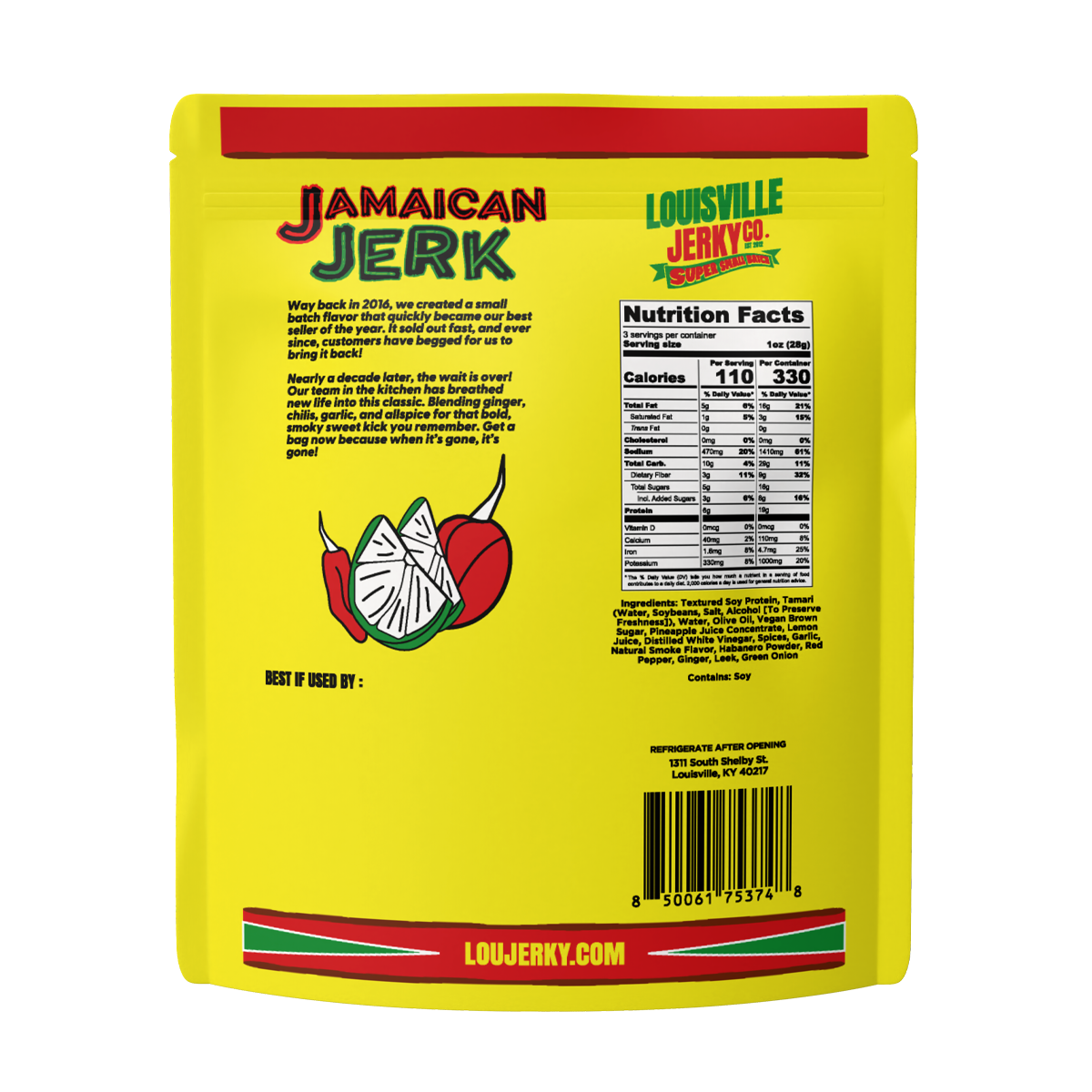 Ingredients: Textured Soy Protein, Tamari (Water, Soybeans, Salt, Alcohol [To Preserve Freshness]), Water, Olive Oil, Vegan Brown Sugar, Pineapple Juice Concentrate, Lemon Juice, Distilled White Vinegar, Spices, Garlic, Natural Smoke Flavor, Habanero Powder, Red Pepper, Ginger, Leek, Green Onion